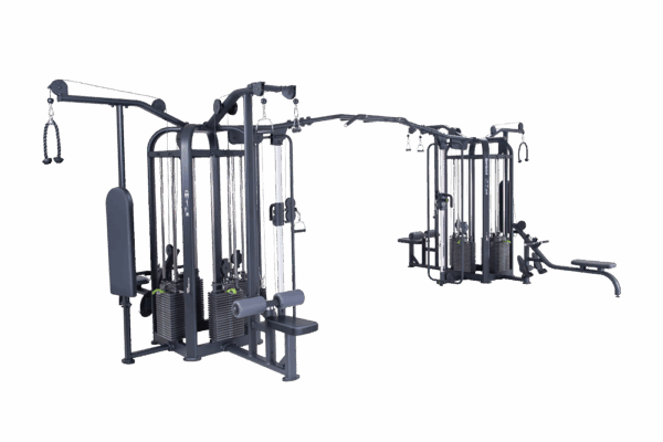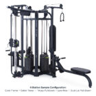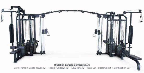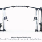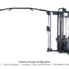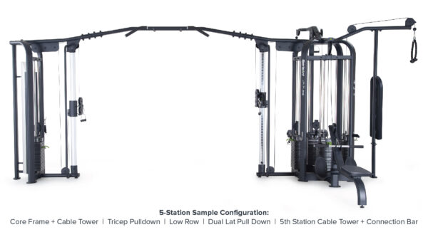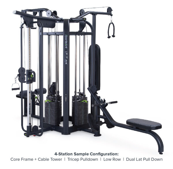 Comes standard with a cable tower with remaining three stations can be configured with any combination of cable tower, tricep pushdown, dual lat pulldown or low row